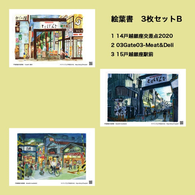 水彩絵ハガキ:戸越銀座にあるゲートの入っている絵を3枚セットにいたしました。こちらのセットBの内容は、セザンヌの色合いで描いた戸越金座交差点のゲート、レンブラントの強いコントラストで描いたミート&デリ付近のゲート、ドガのように構図にこだわった戸越銀座駅前のゲートの3枚になっています。
